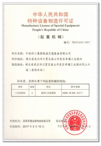 详细摘要: 中华人民共和国特种设备制造许可证门式起重机C级