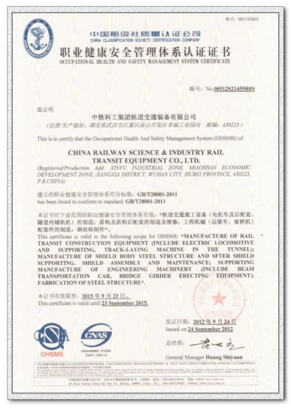 详细摘要: 职业健康安全管理体系认证证书